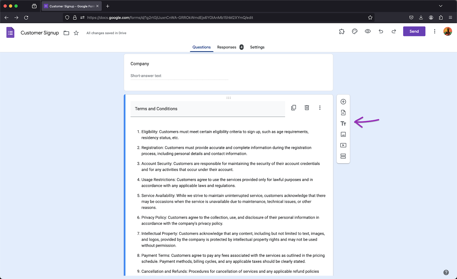Google Forms does not have a built-in widget to add the terms and conditions within the form itself, but you can add the terms and conditions in the description for the TT option or include the link to your terms and conditions page in the description option for the checkboxes question or use the Formesign - Fillable PDF addon to show the consent screen with the terms and conditions.