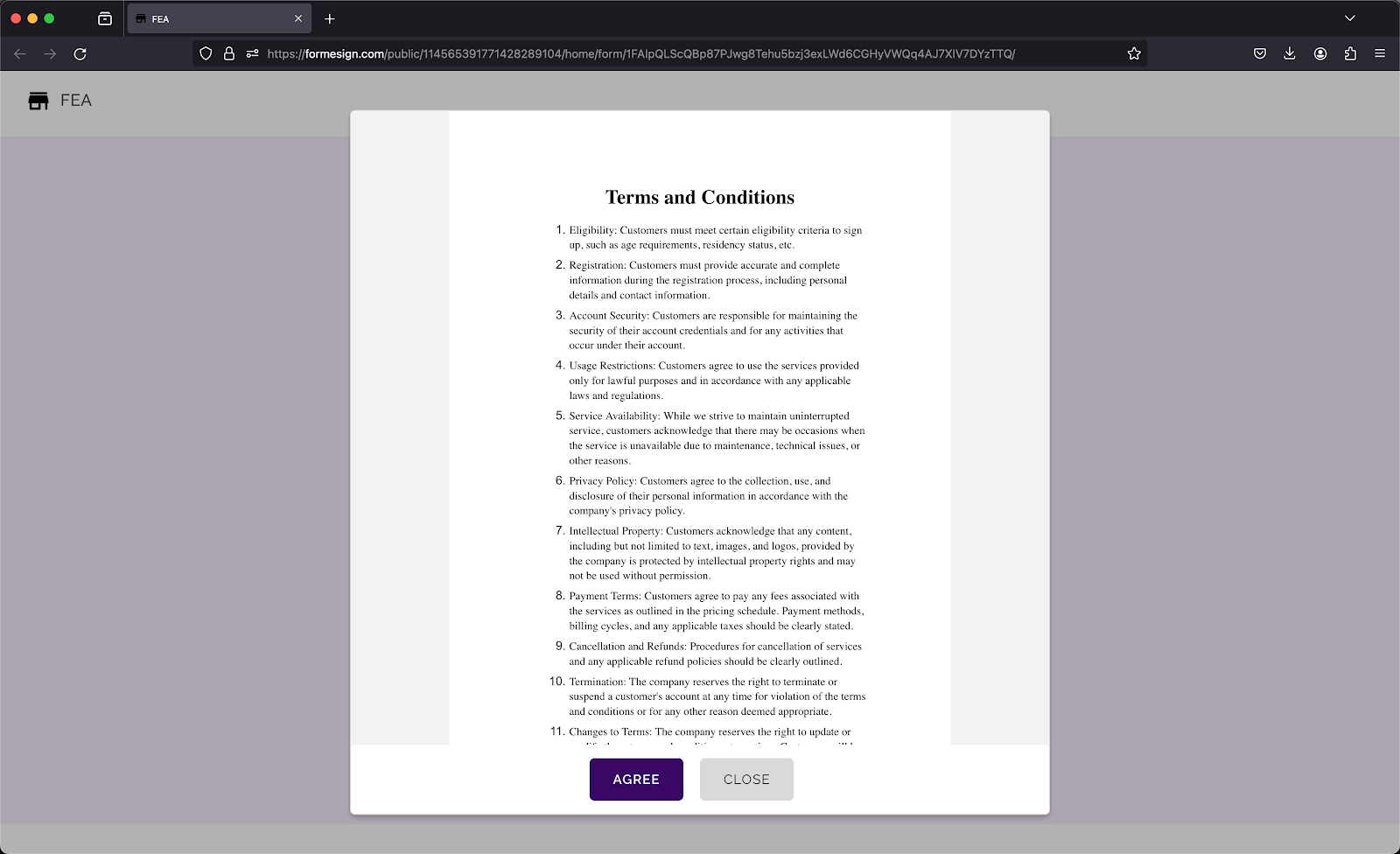 When the user fills the form and clicks on the submit button, the consent screen will be displayed. Users can review the terms and conditions and then click on the Agree button to submit the response or click Cancel. The clickwrap agreements are often considered more legally enforceable than checkbox agreements because they require users to take an affirmative step to demonstrate consent.